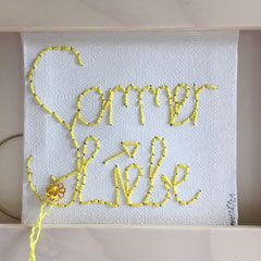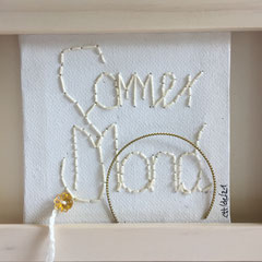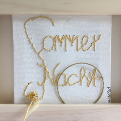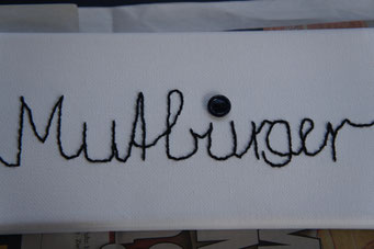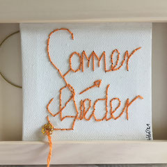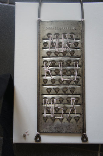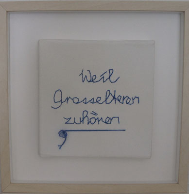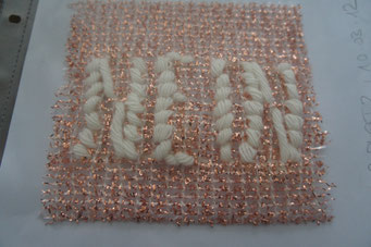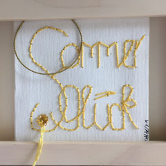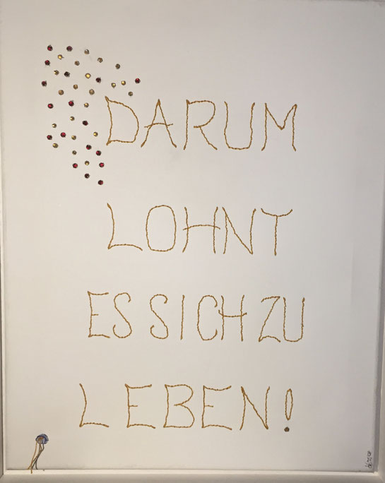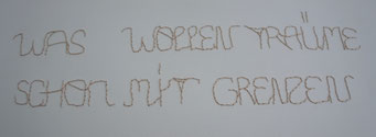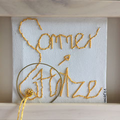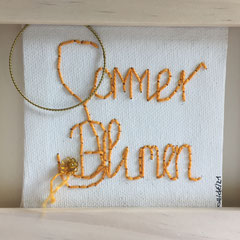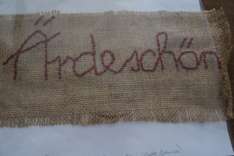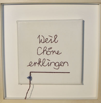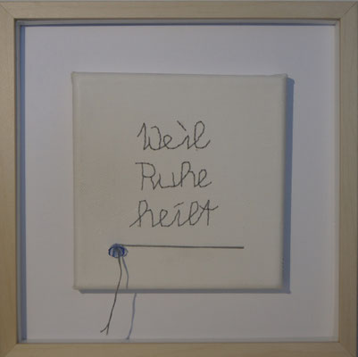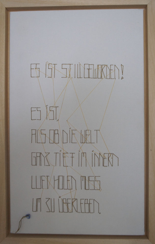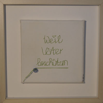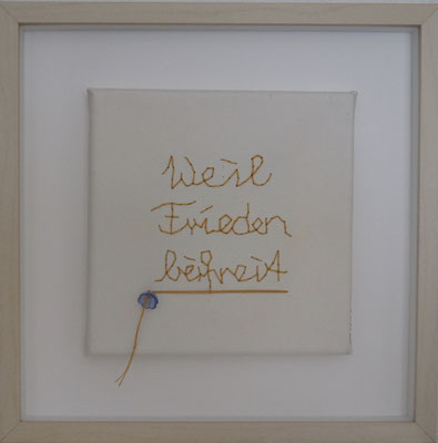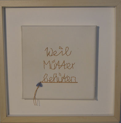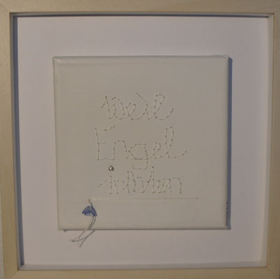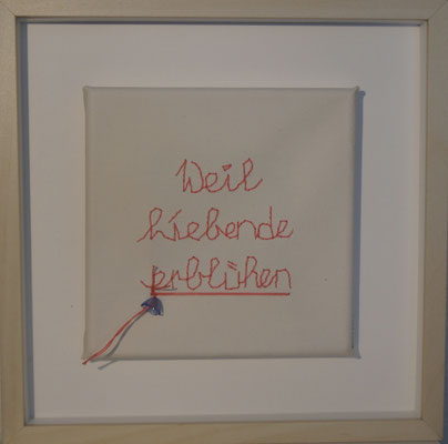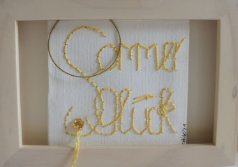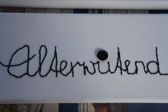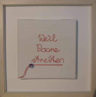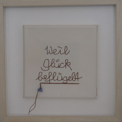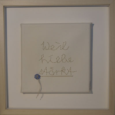 Sie hat mich so richtig gepackt! Die Stickerei nämlich, oder besser die Stichelei. Nicht, dass ich etwa Tischtücher, Servietten oder ähnliches besticke, nein, ich habe angefangen auf Leinwand zu sticken. Kurz darauf waren es schon Materialien wie Büttenpapier, Wellkarton, Samt, Jute, Plastik, sogar Holz und so fort. Nichts ist im Moment sicher vor meinen Nähnadeln. Es sind aber nicht Blumenkränze, exotische Muster die auf meine Bilder kommen, nein, es sind vor allem WORTE, Grafiken, Muster, Querbeet - Alles ist möglich! Von der Liebeserklärung, über die Geburtsanzeige zum Philosophischen, gestichelte Frauenakte und Gesichter sind entstanden, fast uferlos und das im guten Sinn.